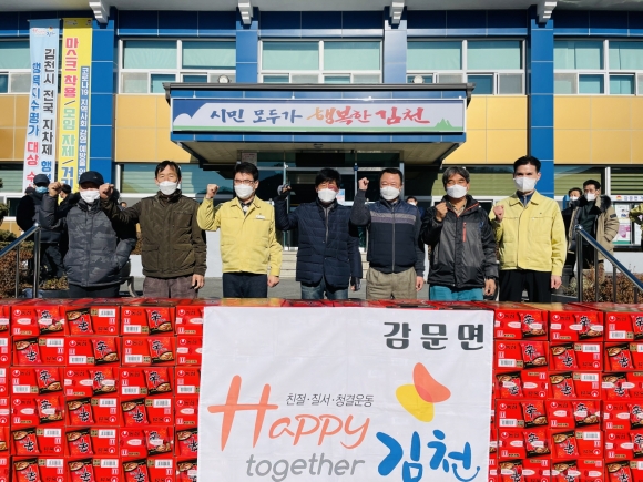 | 감문면 이장협의회(회장 송진호)는 1월 6일 관내 소외된 이웃이 따뜻한 겨울을 보낼 수 있도록 라면 150박스를 기부하였다.