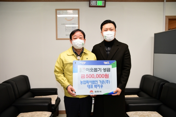 | 희망2021나눔캠페인에 농업회사법인 가온(주)도 동참했다. 농업회사법인 가온(주)(대표 박지우)는 지난 7일 김천시청을 방문하여 50만원의 이웃돕기 성금을 기탁했다.