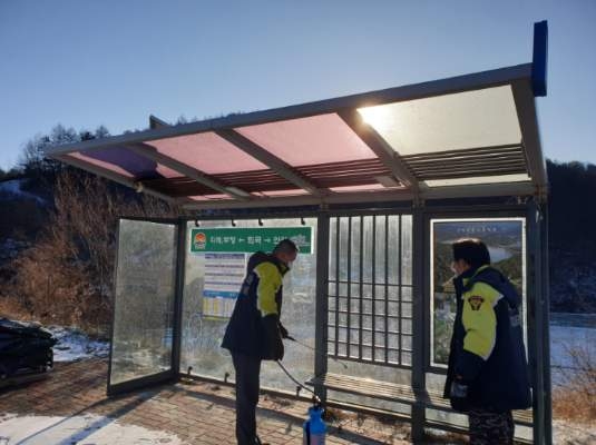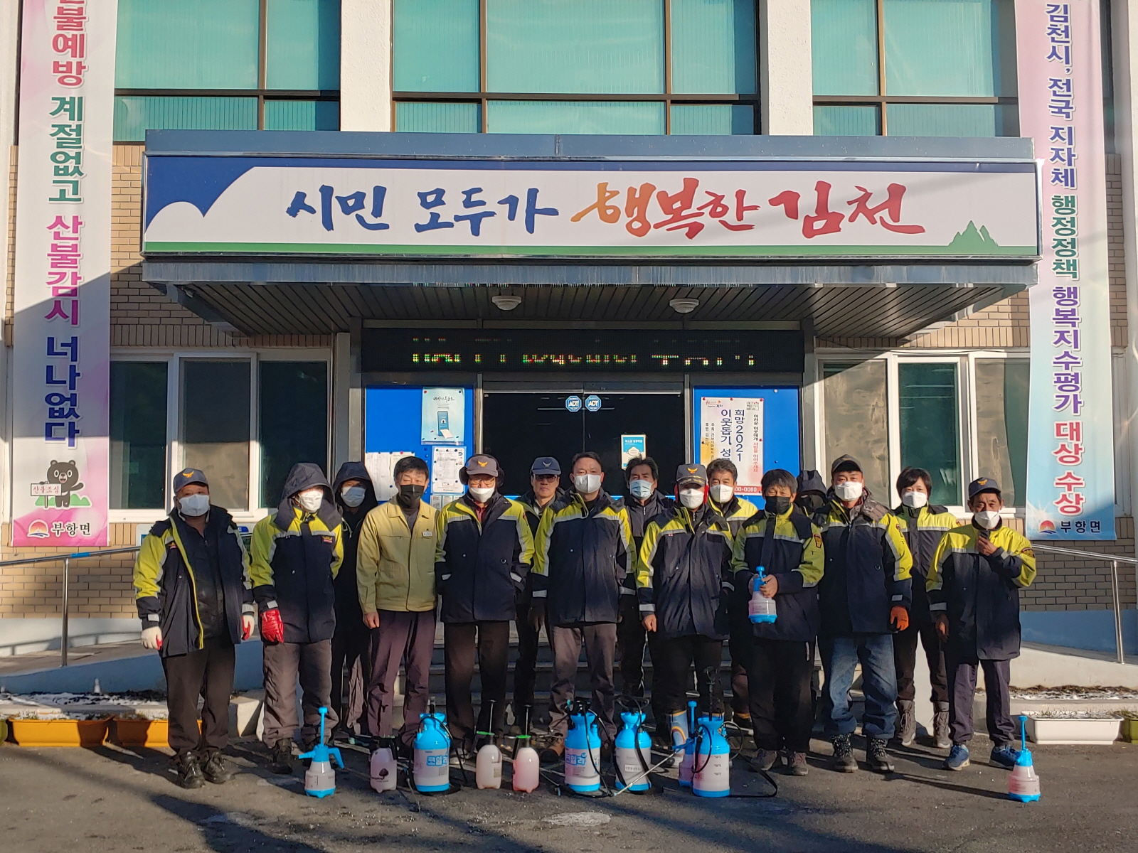 | 부항면 의용소방대(회장 신춘식)는 1월 8일(금) 김천시 일제 방역의 날을 맞아 17명의 회원이 코로나-19 예방을 위한 방역 활동을 실시했다. 부항면사무소 일대와 관내 버스승강장 27개소를 집중적으로 소독했다.