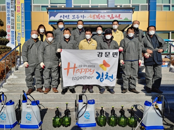 | 김천시 감문면 이장협의회(회장 송진호) 신임 이장단은 1월 8일 오전 11시 코로나19 감염증 확산방지를 위한 방역 소독활동을 실시했다.