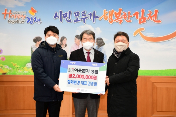 | 정화환경(대표 김종철)은 지난 1월 8일 김천시청을 방문하여 이웃돕기 성금 200만원을 전달했다.