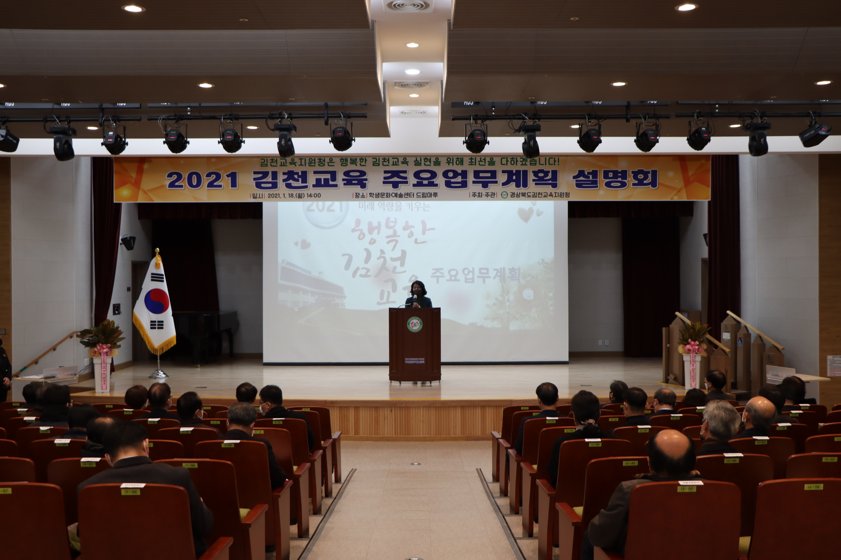 | 경상북도김천교육지원청(교육장 마숙자)는 1월 18일(월) 학생문화예술센터 드림마루에서 관내 유‧초‧중‧고‧각종학교 교(원)장 50여명을 초청하여 2021 김천교육 주요업무계획 설명회를 개최하였다.