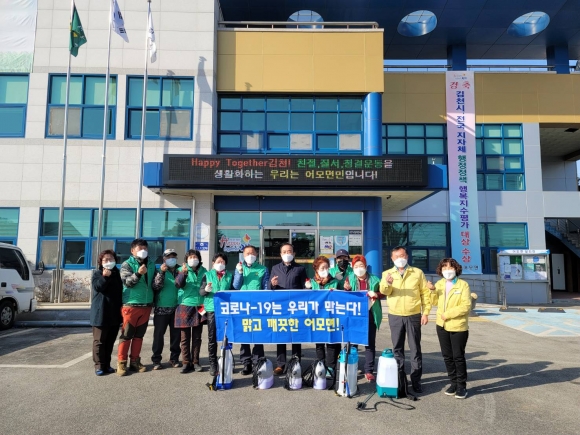 | 지난 15일 어모면 새마을협의회(회장 박천길, 김윤기)는 김천시 ‘일제 방역의 날’에 동참하여 코로나19 확산 방지를 위해 관내 다중이용시설과 버스승강장을 중심으로 방역을 실시하였다.