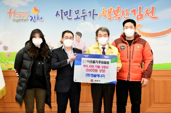 김충섭 김천시장은 “어려운 경기에도 불구하고 이웃을 위해 나눔을 실천해주시는 ㈜청솔에너지에 깊은 감사를 드린다. 전해주신 물품은 정성을 담아 도움이 필요한 곳에 잘 전달하겠다.”며 감사의 인사를 전했다.