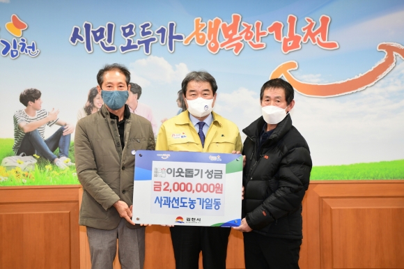 | 김천시 사과재배 선도농가 박병윤외 1명이 지난 15일 김천시청을 방문해 연말연시 어려운 이웃에게 전달해 달라며 사랑의 성금 200만원을 전달했다.