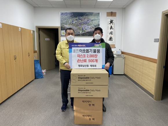 | 평화남산동 체육회(회장 김세호)에서 코로나19 극복의 염원을 담아 마스크 1,000장과 핫팩 500개를 19일 평화남산동에 기증하였다.