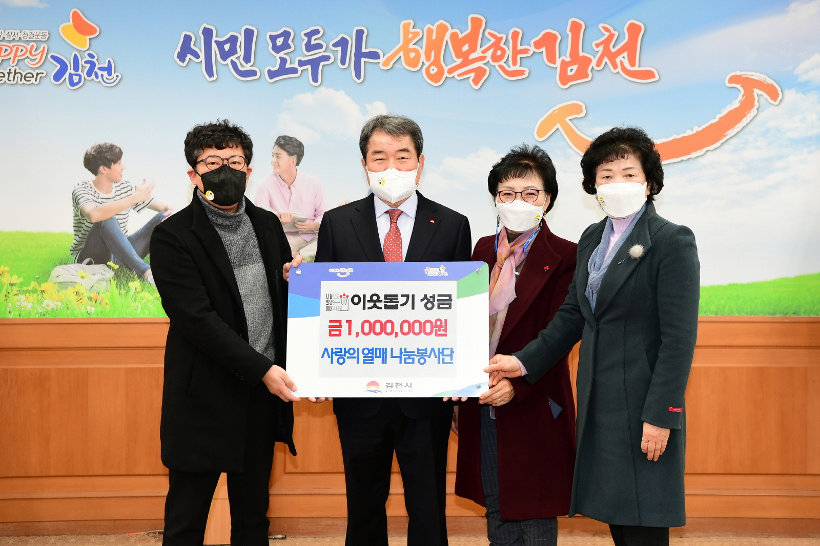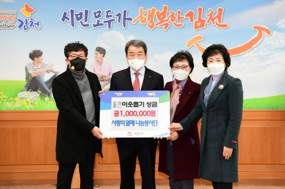 | 김천 ‘사랑의 열매 나눔봉사단’(단장 박유순)은 21일 김천시청을 방문하여 이웃돕기 성금 100만원을 전달했다.