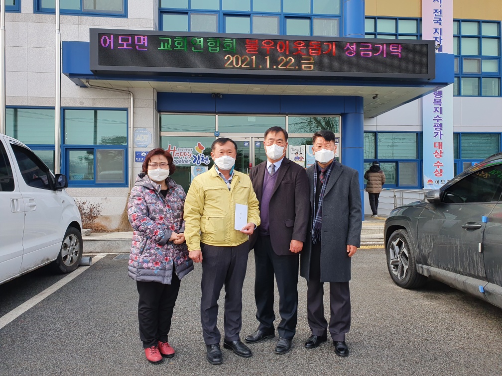 | 어모면 교회연합회(회장 이현강)에서 1월 22일 어모면사무를 방문해 어려운 이웃에게 써 달라며 불우이웃돕기 성금(50만원)을 전달했다.