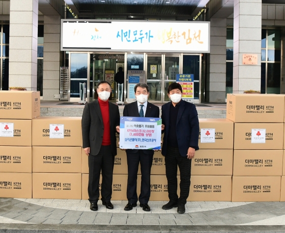| 실리콘밸리 주식회사(대표 윤경섭)와 한국신호공사(대표 김덕수)는 지난 26일 김천시청을 찾아 1,600만원 상당의 KF94 마스크 3만2천장을 전달했다.