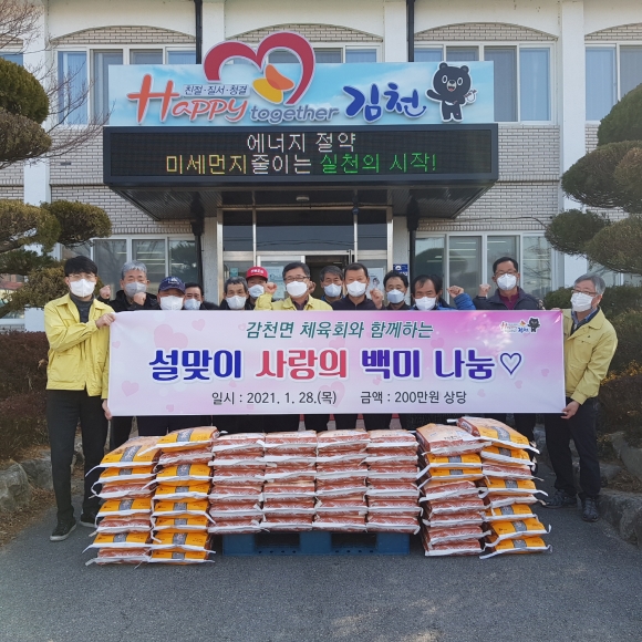 | 민족 대명절인 설을 맞아 1월 28일 감천면 체육회(회장 송연호)는 소외계층을 위해 써달라며 백미10kg 55포(200만원 상당)를 감천면사무소에기부했다.