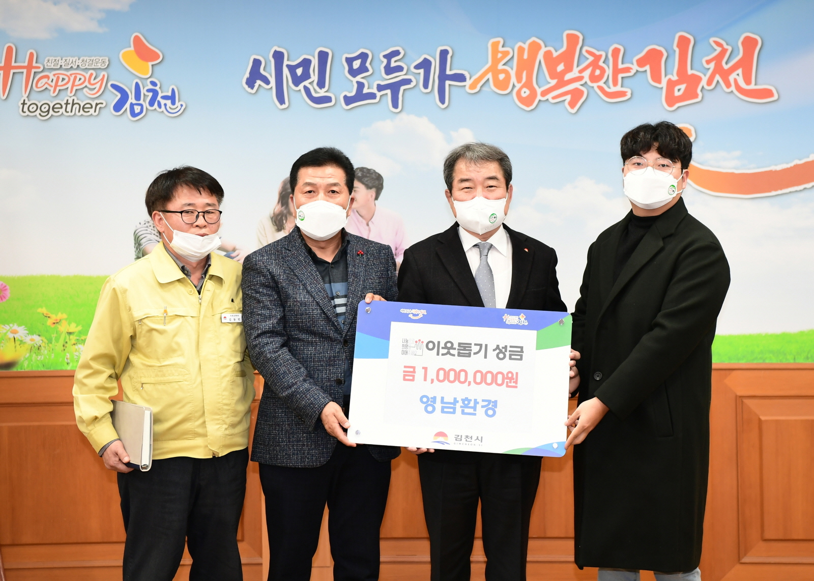 김충섭 김천시장은 “코로나19로 경제적으로 매우 어려운 시기임에도 불구하고 이웃들을 위해 귀한 성금을 기탁해주신 영남환경 여환균 대표님께 깊은 감사를 드린다. 따뜻한 온정이 담긴 성금은 관내 어려운 이웃들을 위해 소중하게 사용하겠다.”고 전했다.