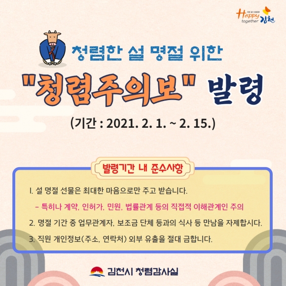 | 김천시(시장 김충섭)는 설 명절 기간을 맞아 2월 1일부터 2월 15일까지 청탁금지법 및 공무원행동강령을 지킬 수 있도록 전 직원을 대상으로 ‘청렴주의보’를 발령했다.