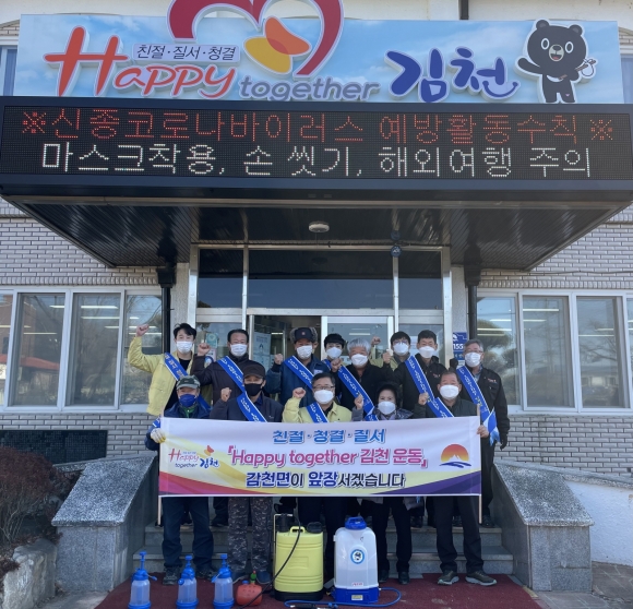 | 감천면 자연보호협의회(회장 이상진) 회원 30여명은 설 명절을 맞이하여 Happy together 김천 운동에 동참하고자 2월 3일 오전 감천면 무안천 주위 및 버스승강장 등에 국토대청결 및 방역활동을 실시했다.