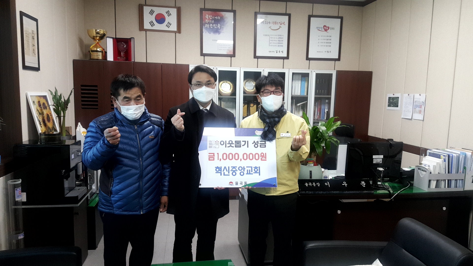 이날 혁신중앙교회 이충현 목사와 성도일동은 코로나19로 어려운 상황에서도 주변의 생활이 어려운 이웃을 위해 써 달라며 이웃돕기 성금 100만원을 기탁했다.