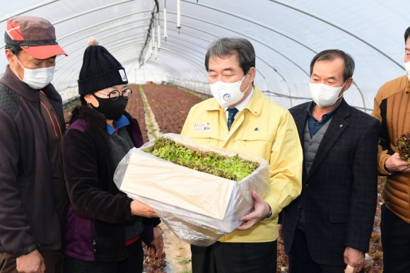 | 김충섭 김천시장은 지난 5일 코로나-19로 인해 어려운 시기를 겪고 있는 민생 현장 방문의 일환으로 관내 시설채소 재배 농가를 방문하여 현장을 살펴보았다.