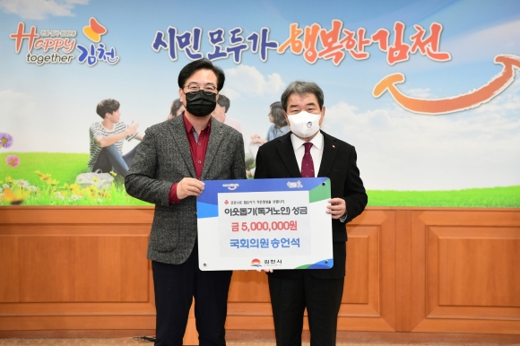 | 송언석 국회의원은 지난 6일 김천시청을 방문하여 코로나19로 힘든 시기에 이웃사랑을 실천하기 위해 이웃돕기 성금 500만원을 직접 전달했다.