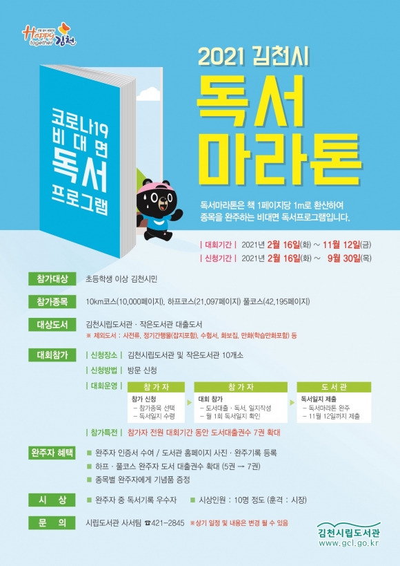 | 김천시(시장 김충섭)에서는 함께 읽고 성장하는 명품도시 김천의 해피투게더운동 확산을 위해 2월 16일부터 11월 12일까지 「독서마라톤 대회」를 개최한다.