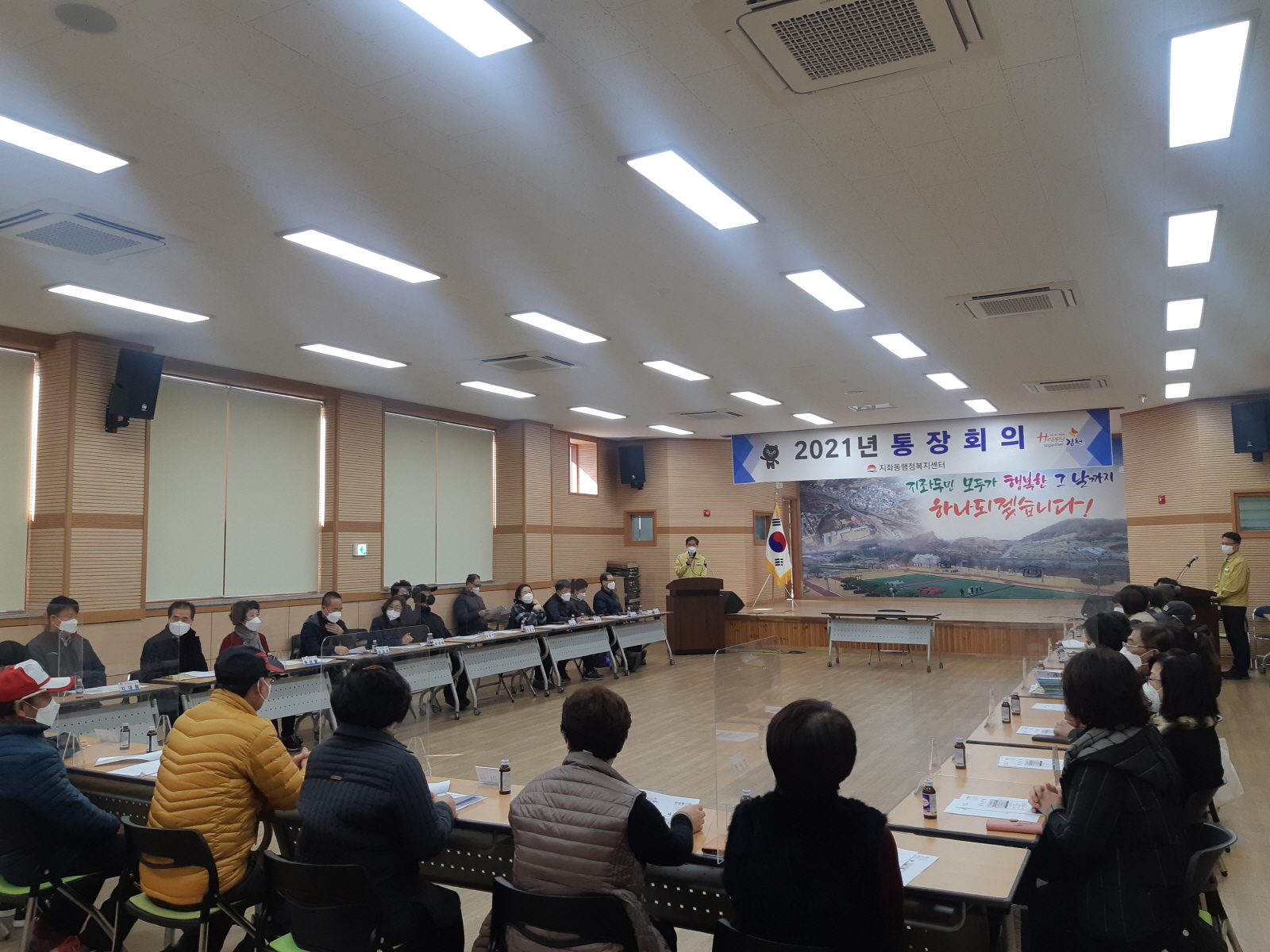 | 지좌동 행정복지센터(동장 이종탁)은 2월 8일 지좌동 행정복지센터 3층 강당에서 김병철, 전계숙 시의원 등이 참석한 가운데, 2021년 2월 통장회의를 개최했다.