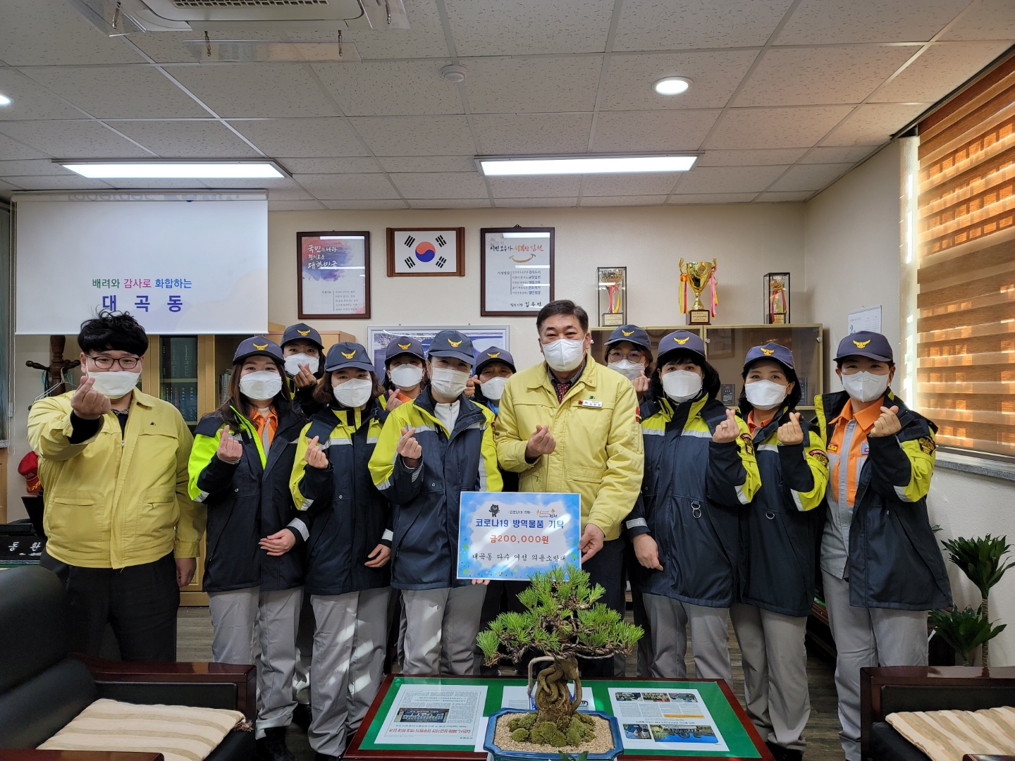| 대곡동 다수 여성 의용소방대(대장 임은희)는 2월 9일 코로나19 확산방지를 위해 써달라며 대곡동 행정복지센터를 방문하여 방역물품 20만원 상당을 기탁하였다.