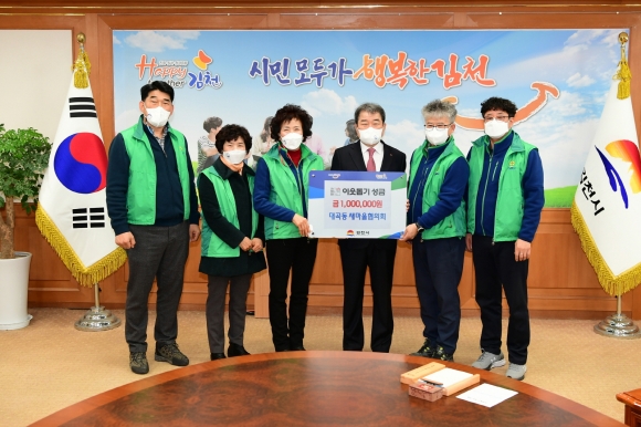 | 김천시 대곡동 새마을남여지도자협의회(협의회장 이도희, 부녀회장 박명희) 임원진은 2월 19일 김천시청을 방문하여 어려운 이웃을 돕는 곳에 전달해 달라며 성금 100만원을 기탁하였다.