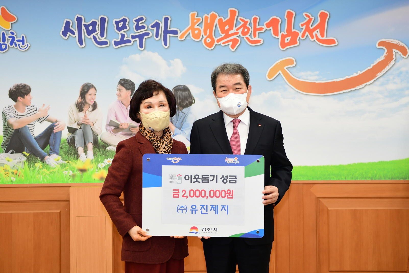 | ㈜유진제지(대표 김은숙)는 지난 19일 김천시청을 직접 방문해 지역의 어려운 이웃을 위해 써달라며 성금 200만원을 기탁했다. 유진제지는 김천시 응명동에 위치한 미용티슈, 키친타올, 화장지 등을 제조하는 업체로 작년 3월에도 코로나19 특별모금으로 성금 100만원을 기탁한 바 있다.