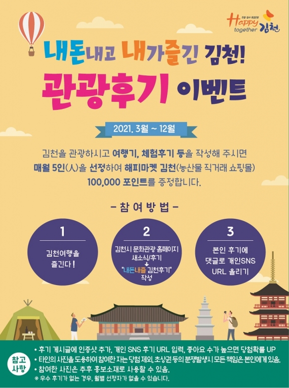 | 김천시(시장 김충섭)가 3월부터 12월까지 김천을 관광하는 여행객들을 대상으로“내돈내즐 김천 관광 후기 이벤트”를 시작한다.