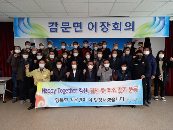 감문면은 김천시의 북부에 위치하며 동으로는 구미시, 북으로는 상주시와 접경을 이루고, 영산인 백운산(해발 618.3m) 자락 곳곳에 산재한 옛 감문소국의 유적들을 고스란히 간직하고 있는 선조들의 얼이 빛나는 충효의 고장으로, 샤인머스캣 대표 산지로서 전국 각지 소비자들에게 그 이름을 널리 알리고 있다. 28개의 마을의 이장들로 구성된 감문면 이장협의회는 불우이웃돕기, 코로나19 방역활동과 마을 청결활동에 주민들의 복지와 안전을 위한 자발적인 노력을 아끼지 않으며 Happy Together 친절⦁질서⦁청결 활동의 모범사례로서 활동을 계속하고 있다.