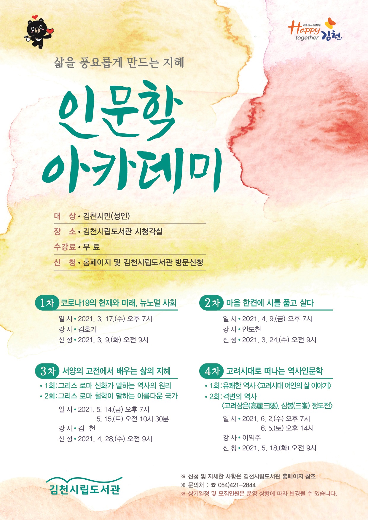 | 김천시립도서관(관장 백선주)에서 '삶을 풍요롭게 하는 지혜, 2021 인문학 아카데미'를 오는 3월 17일을 시작으로 총 4차에 걸쳐 시립도서관 시청각실에서 운영한다.