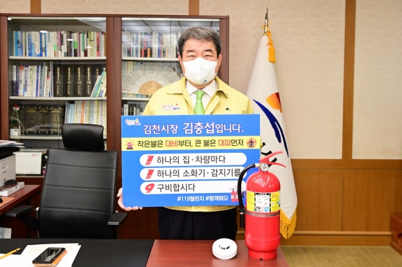| 김충섭 김천시장은 3월 5일 주택용 소방시설인 화재감지기와 소화기의 중요성을 알리는 119 릴레이 챌린지에 동참했다.