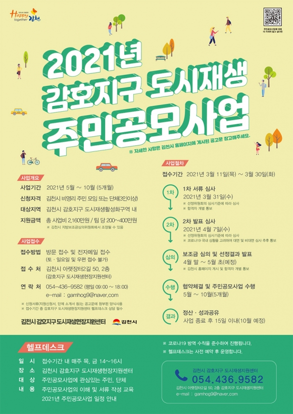 이번 공모사업은 감호지구 도시재생 및 공동체 활성화 등에 적합한 사업을 직접 제안하고 실행하여 도시재생사업에 대한 이해와 참여 기회 제공, 마을공동체 역량 강화, 지속 가능한 도시 기반 구축을 위한 도시재생 뉴딜사업으로 김천시 소재 3인 이상으로 구성된 비영리 주민 모임 또는 단체가 참여할 수 있으며, 총사업비 2,160만원으로 사업당 최소 200만원 ~ 최대 400만원을 지원한다.