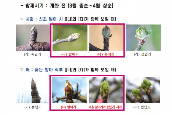 과수 피해를 예방하기 위한 과수화상병 약제 적기살포 시기는 (사과) 새로운 가지가 나오기 전, (배) 꽃눈이 트기 직전으로 등록약제에 표시된 표준 희석배수 준수, 농약 안전 사용법을 확인한 뒤 방제해야 한다.