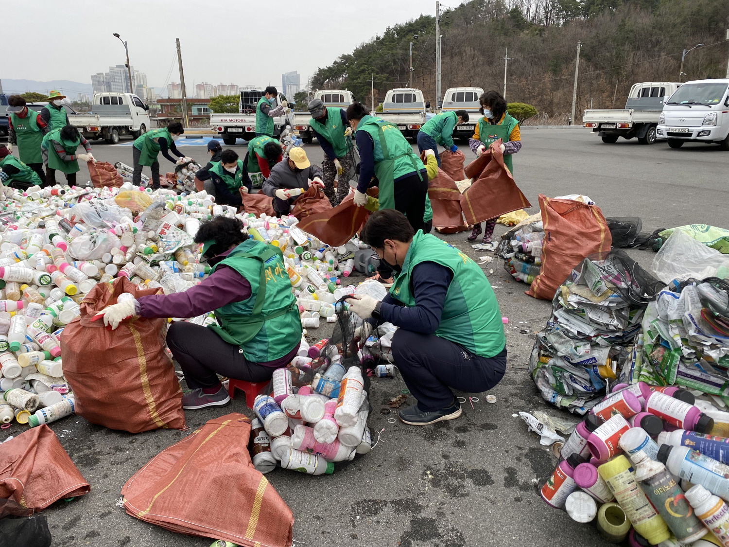 전날 18일 오후 2시부터 새마을협의회 임원 10여명은 각 마을별로 빈 농약병 및 봉지를 수거하였고, 오늘 아침 8시 남면 복지회관 주차장에서 새마을협의회 남녀지도자들이 수거된 농약 빈병 및 봉지를 3시간에 걸쳐 분류하는 작업을 했다.