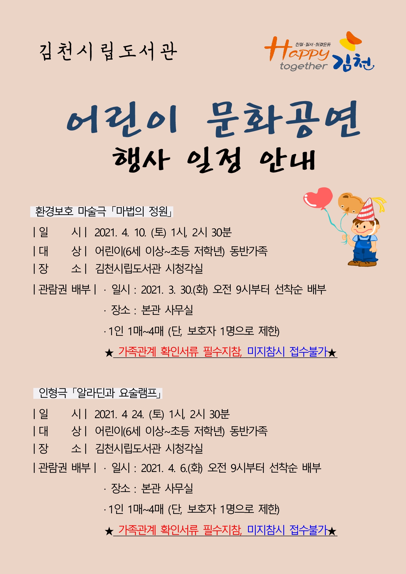 | 김천시립도서관에서는 어린이들을 위한 문화공연으로 오는 4월, 5월에 마술극‘마법의 정원’외 2개의 공연을 준비하고 있다고 밝혔다.