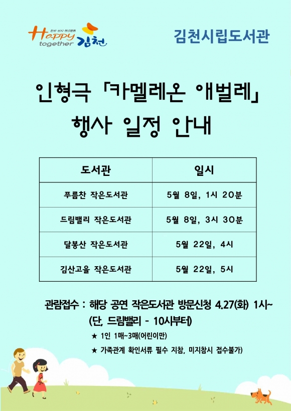5월 8일, 5월 22일에는 상반기 마지막 공연으로‘카멜레온 애벌레’가 푸름찬, 드림밸리, 김산고을, 달봉산 4개소에 찾아갈 예정이다. 애벌레가 변화하는 과정을 인형극과 마술을 통해 보여주며 색다른 재미를 선사한다.