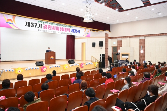 | 김천시평생교육원에서는 3월 24일(수) 10시 교육원 대강당에서 김충섭 시장, 이우청 의회의장, 총동창회(회장 서지선) 임원, 여성대학 수강생 등 100여명이 참석한 가운데 「2021년 제37기 김천시여성대학」개강식을 가졌다.