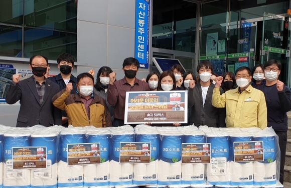 | 김천시 자산동 지역자활기업인 ㈜행복공간에서는 24일 지역의 소외계층에 전달해 달라며 동 주민센터를 방문해 휴지 50박스를 전달했다.