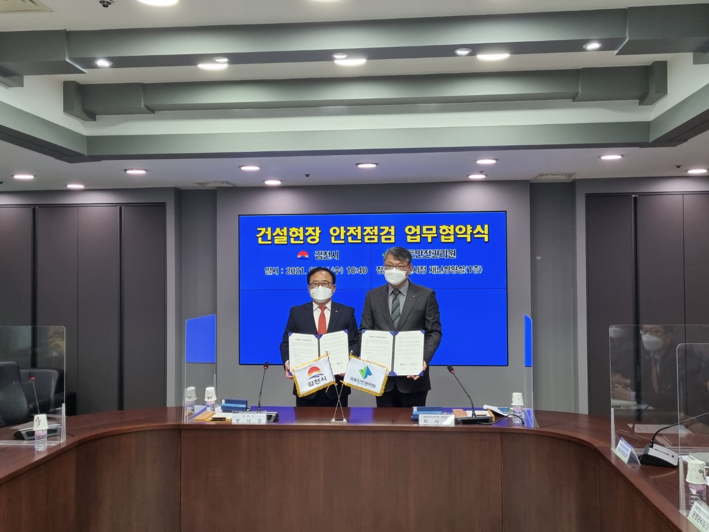 | 김천시(시장 김충섭)는 24일 시청 재난상황실에서 건설현장의 안전확보와 안전한 건설문화 정착을 위해 이창재 김천시 부시장, 국토안전관리원 영남지사장, 건축사협회 김천시지회장 등 관계자가 참석한 가운데 국토안전관리원 건설현장 안전점검 업무협약(MOU)을 체결했다.