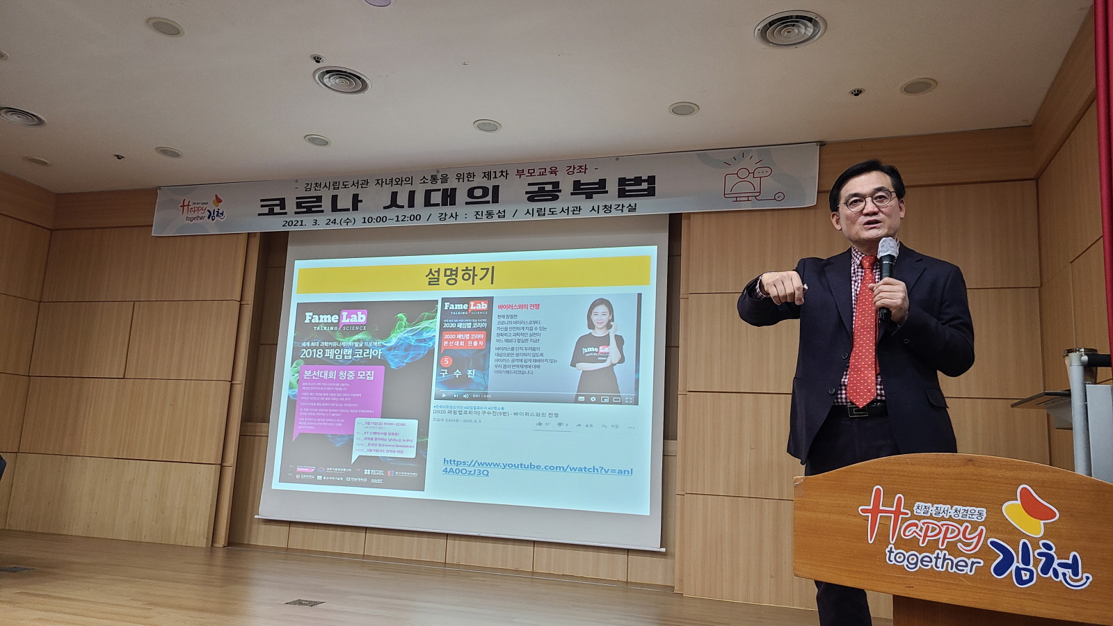 | 김천시립도서관(관장 백선주)에서는 전 서울대학교 입학사정관이며 우리나라 최고의 입시전문가 진동섭 강사를 초청, ‘코로나 시대의 공부법’이란 주제로 진행하여 참가한 부모님들에게 큰 호응을 받았다.