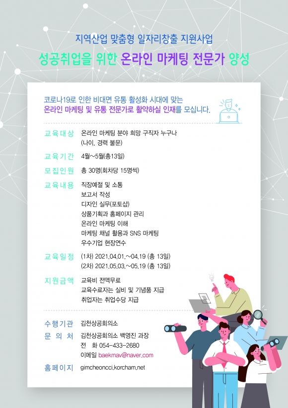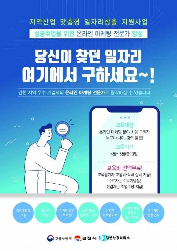 코로나19로 인한 고용환경 악화와 경기침체 등으로 더욱 힘들어진 지역 일자리 상황을 고려하여 김천시와 김천상공회의소는 비대면 시대에 발맞춰 사전 조사를 통해 수요가 늘어나고 있는 온라인 유통 관련 분야에서 일할 온라인 마케팅 전문가를 발굴·양성하기 위해 발벗고 나섰다.
