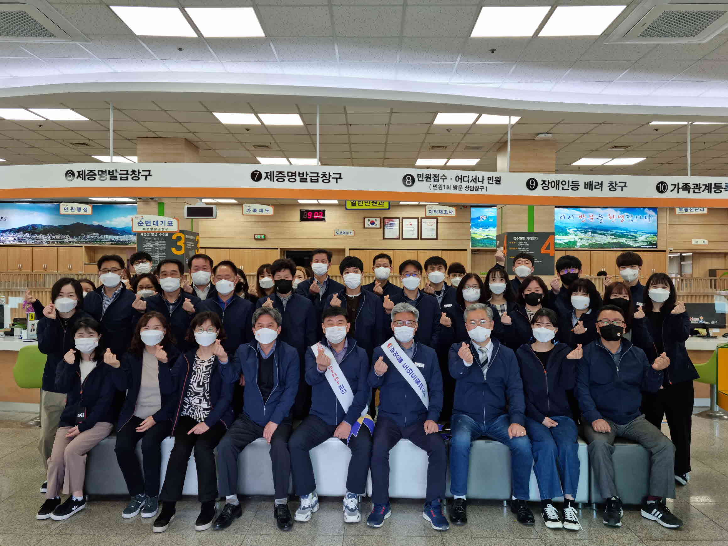 종합민원실 전직원들 모두가 happy together 운동 및 청렴실천 다짐을 통하여 적극적인 민원안내 서비스 제공, 민원창구 친절실명제를 운영하여 민원서비스 제공에 최선을 다하겠다고 말했다. |