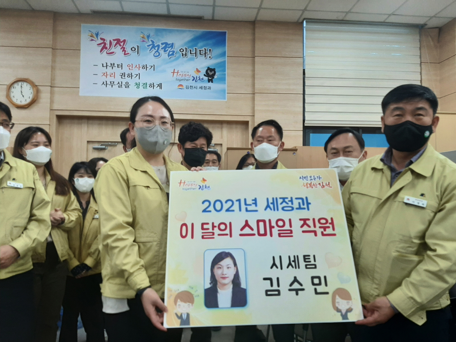 | 김천시(시장 김충섭) 세정과에서는 “친절”을 공직자의 가장 큰 덕목으로 삼고, 친절이 최선의 행정서비스이며, 시민을 행복하게 하는 첫걸음으로 생각하고 직원 모두가 친절할 수 있는 계기가 되고자 “이 달의 스마일 직원”을 선정·격려하기로 계획하고, 3월 스마일 직원으로 세정과 시세팀에 근무하는 김수민 직원을 선정하고 격려하였다.