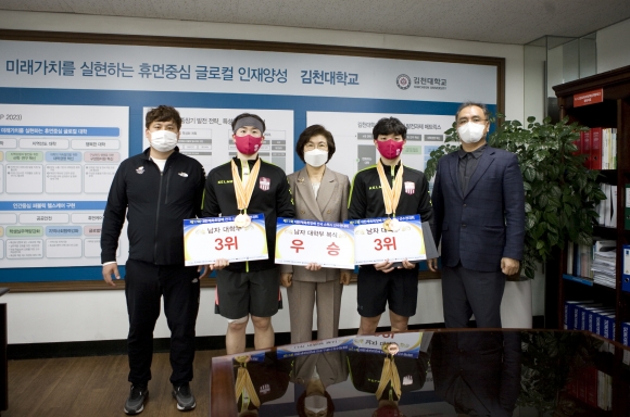 | 김천대학교(총장 윤옥현) 스쿼시부가 창단 첫해 첫 전국대회인 제17회 대한체육회장배 전국스쿼시 선수권대회에서 남자 대학부 복식 우승, 단식 3위를 기록하는 등 놀라운 성과를 올리며 대학부 다크호스가 아닌 최강팀으로 자리매김하는 초석을 다져놓았다.