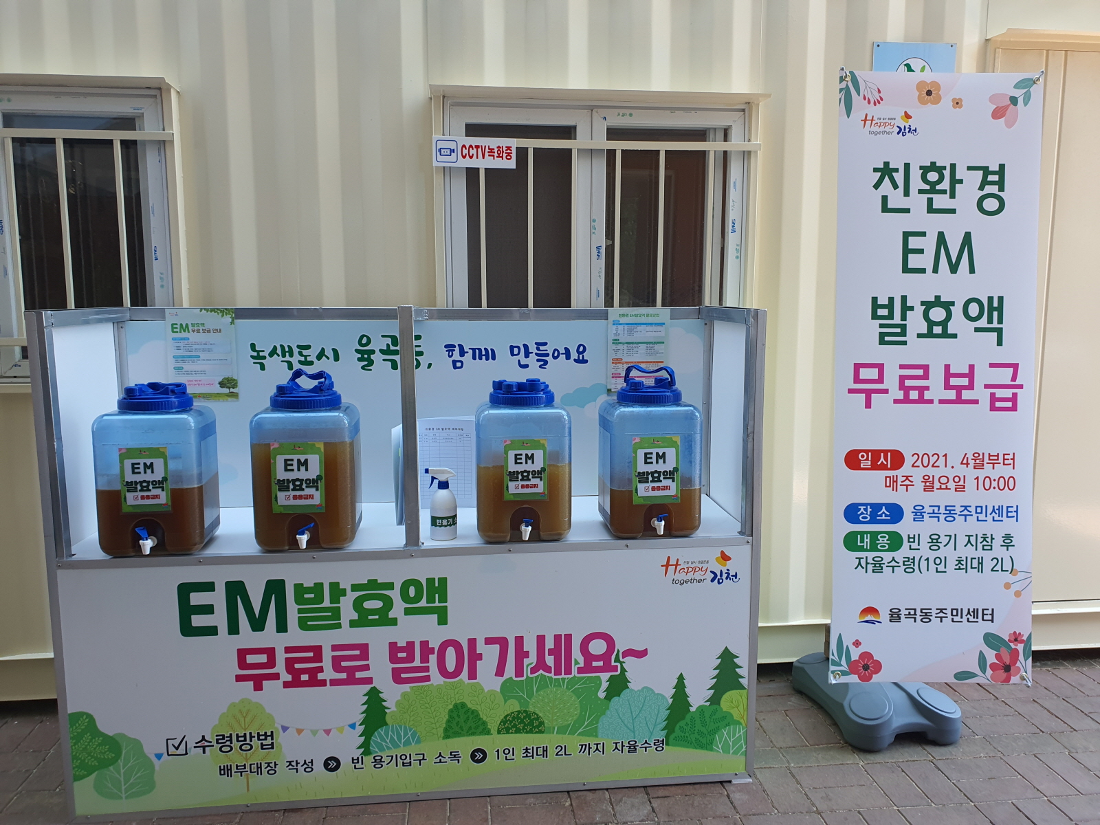 | EM 발효액은 매주 월요일 오전 10시부터 배부를 시작하여 소진될 때까지 보급하며, 주민은 생수병 등 빈 병을 준비해서 율곡동주민센터를 방문하면 1인 최대 2L까지 받을 수 있다.