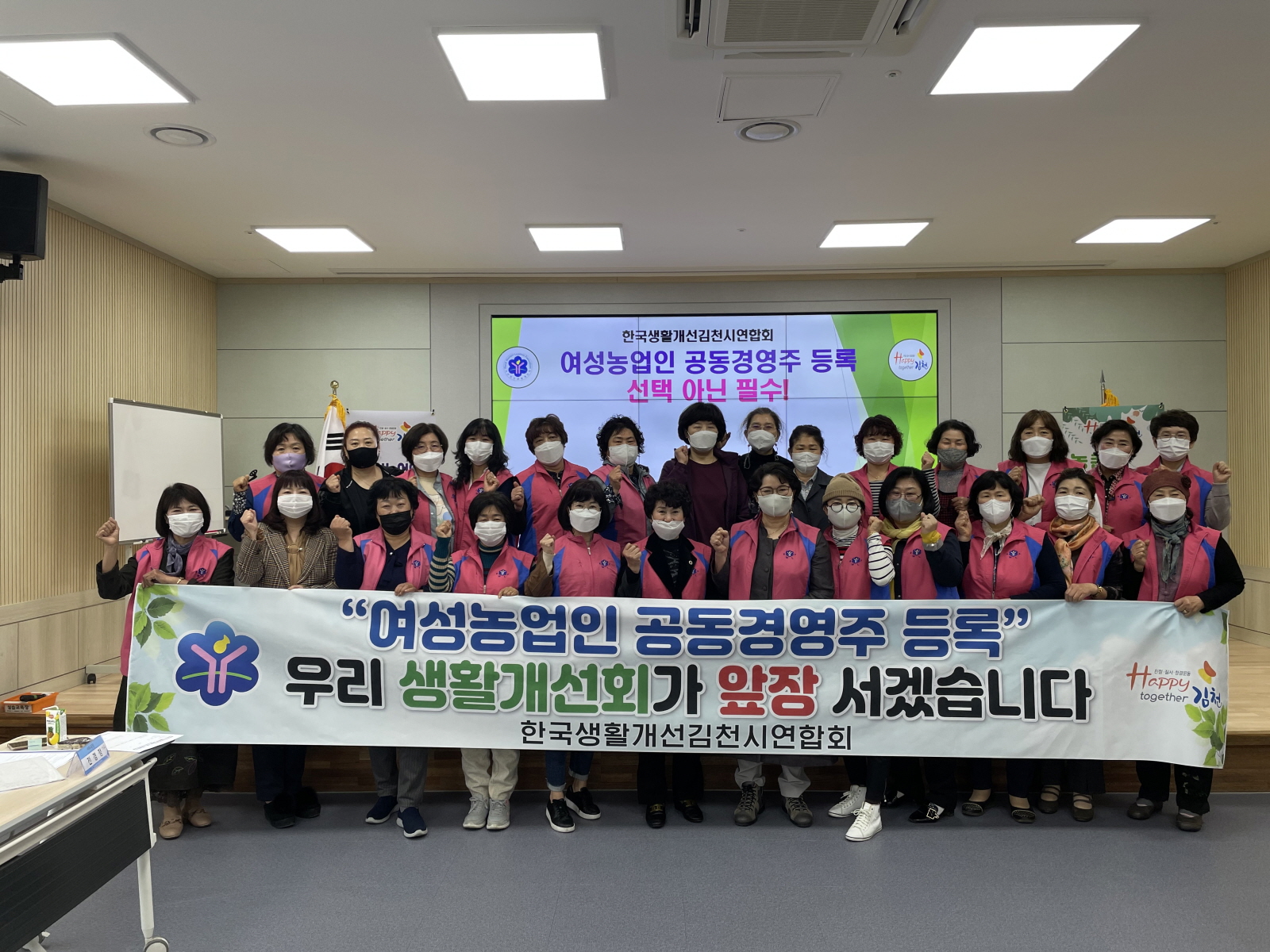 이날 캠페인에 앞서 생활개선김천시연합회(회장 김지현)와 읍면동 회장단을 대상으로 여성리더로서 사람의 마음을 사로잡는 대화기법 특강을 통해 여성지도자로서 갖춰야 할 역량을 강화하고 많은 여성농업인들이 공동경영주를 등록할 수 있는 다양한 방안을 모색하였다.