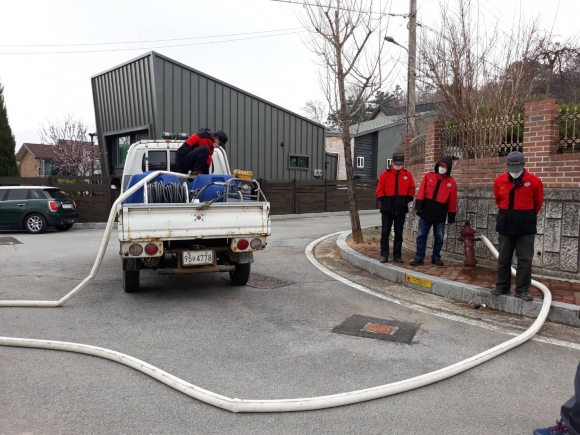 이번 교육은 역할분담을 통해 중·소형 엔진펌프 운용능력 점검, 간이 수조 설치, 호스연결 시범·실습을 통해 산불발생 시 신속하게 산불진화작업이 이루어질 수 있도록 교육참가자 전원이 직접 실습에 참여하였다.