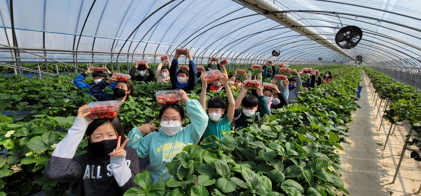 이번 딸기 따기 체험은 코로나19 예방을 위해 저학년과 고학년으로 나누어 양일간에 실시하였으며, 사회적 거리유지, 마스크 착용 및 손 소독 등 방역 수칙을 철저히 지키는 가운데 실시되었다.