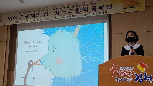 | 김천시(시장 김충섭)에서는 지난 4월 7일, 8일 양일간에 걸쳐 YBM 대표 영어지도 강사이자 「엉어 그림책 공부법」의 저자 정정혜 작가를 초청, 제2차 부모교육강좌를 운영하여 참가한 부모님들의 뜨거운 관심을 받았다.