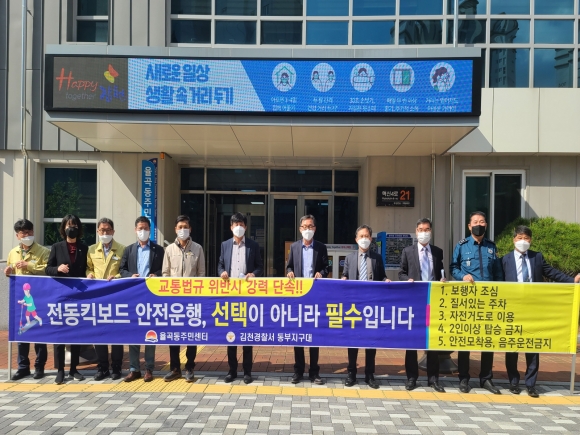 이우문 율곡동장은 “전동킥보드는 율곡동 실정에 맞는 매우 유익한 보조교통수단이긴 하지만 전동킥보드를 이용할 수 없는 학생들이 호기심으로 장난스럽게 전동킥보드를 운행하고 있어 우려가 된다.”며 “오늘 캠페인을 계기로 전동킥보드 부적격 탐승에 대한 경각심을 일깨우고 향후에도 초・중・고등학교, 김천시 동부지구대와 함께 지속적인 계도 활동을 하겠다.”고 했다. 한편 율곡동주민센터는 지난 3월 전동킥보드의 안전한 이용을 위한 현수막을 율곡동 일원에 게첨하였으며 각종 회의시, 밴드, 카페 등에 안전모 착용, 자전거 도로 이용, 보행자 주의, 음주운전 금지 등 전동킥보드 이용 안전수칙을 홍보, 계도하고 있다.