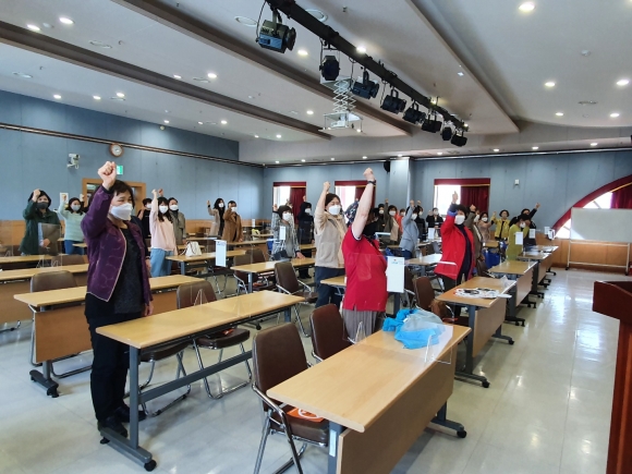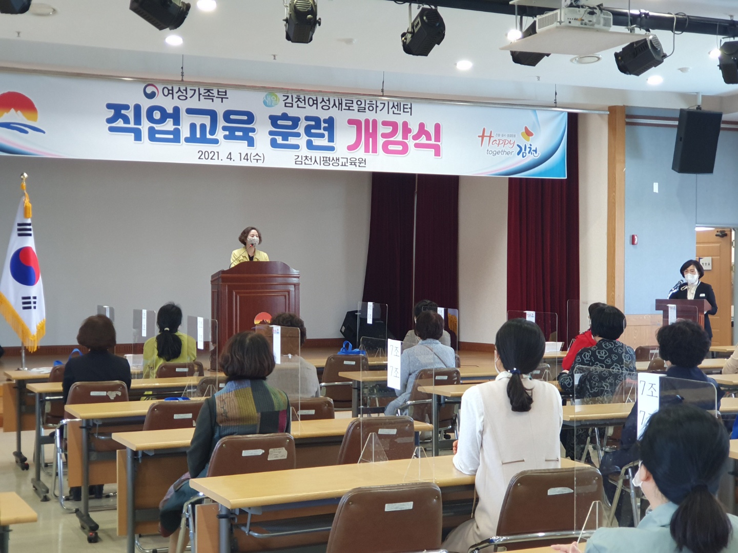 | 김천시 평생교육원에서 운영하는 여성새로일하기센터에서 2021. 4. 14.(수) 교육생 40명이 참석한 가운데 직업교육 훈련 개강식을 개최했다.
