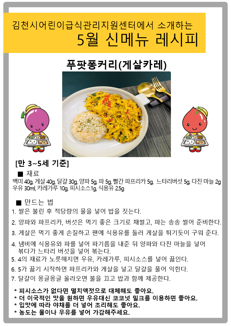 | 김천시 어린이급식관리지원센터(이사장 이창재)에서는 코로나-19로 인한 사회적 거리두기인 시기에 가정에서 활용할 수 있도록 매달 제공되는 식단의 신메뉴 레시피를 영상으로 제작하여 제공하고 있다. 이번 5월 식단의 신메뉴 레시피는 태국식 카레 ‘푸팟퐁커리’ 이다.